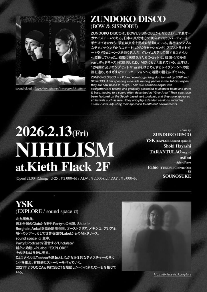 ■LINE UP: ZUNDOKO DISCO, YSK (EXPLORE/sound space α), Shoki Hayashi, TARANTULAO (u.g.m), Fabio (FUNDELIC) from Oita, oxiboi